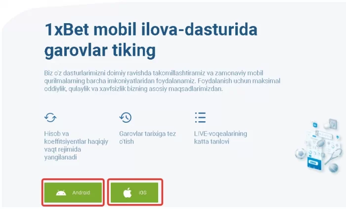 1xbet mobil ilovasining afzalligi shundaki, siz xohlagan joyingizdan sportga pul tikishingiz mumkin. Bunda Uzbekcha versiyasi ham barcha sport turlariga ruscha tildagi kabi pul tikish va zavq olish imkoniyatini beradi. 1xbet com rasmiy saytidagi registratsiya qilish jarayonini mobil ilovadan ham bajarsa bo'ladi.