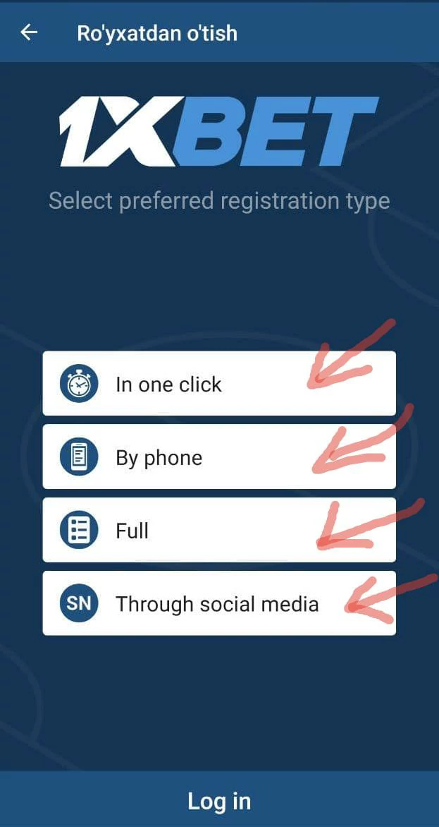 1xbet da registratsiya qilish qiyin emas. Bugungi kunda 1xbet sayti O'zbekistonda 4 xil registratsiya usulini taklif etadi: "Bir bosishda''; "Telefon orqali"; ''E-mail orqali'' va ''Ijtimoiy tarmoqlarΒ orqali''. Bukmeker saytida ro'yxatdan o'tish uchun siz o'zingizga Β qulay bo'lgan registratsiya usulini tanlashingiz mumkin. Keyinchalik muammoga duch kelmaslik uchun, avvalo 1xbet bukmekerning qoida va shartlarini bilishingiz kerak.Β
