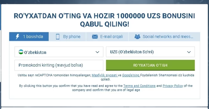 Telefon orqali registratsiya usuli ham juda mashhur, chunki bu sizga tezda pul tikishni boshlash uchun akkauntni telefon raqamiga kelgan tasdiqlash kodi orqali ochishga imkon beradi. Bunda sizning shaxsiy kabinetingizga kirish va parolni o'zgartirish sms kod orqali amalga oshiriladi. Ro'yxatdan o'tish uchun registratsiya qilish bo'limiga o'ting, telefon raqamingiz va o'yin valyutasini ko'rsating. Shundan so'ng, raqamga kod bilan SMS-xabar yuboriladi. Kodni kiritib promokod bo'limiga rasmiy UZCODE promokodini kiriting va jarayonni yakunlang.