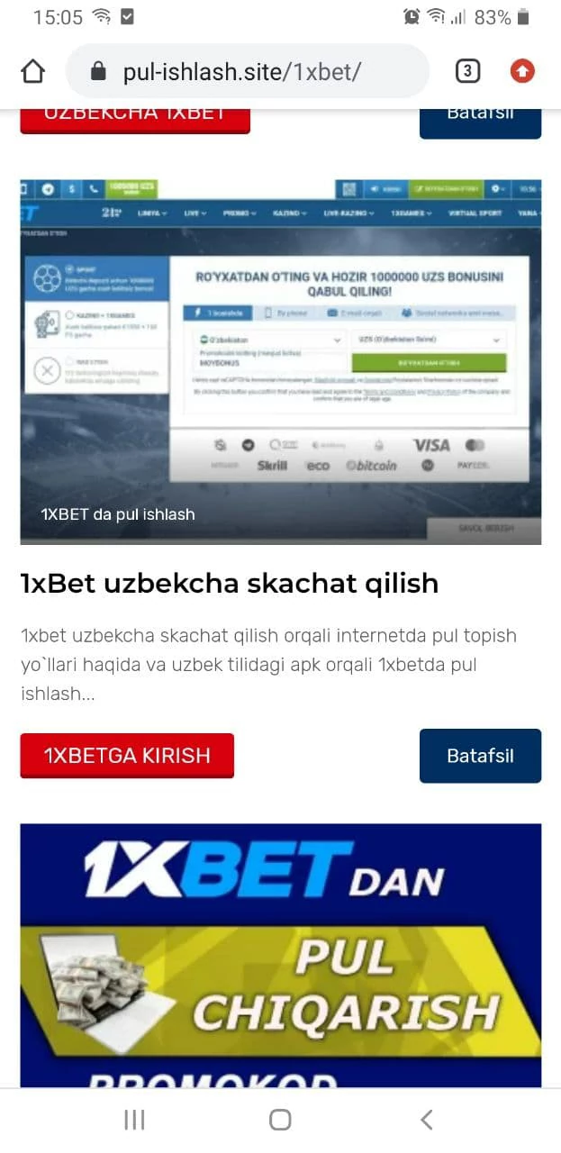 Oddiy va tezkor shartlarini bajarib, siz 1xbet saytida sevimli sport turini tanlab pul ishlashingiz mumkin. Har bir foydalanuvchi 1xbet android ilovasini skachat qilishi mumkin. Yangi registratsiya va hisobini to'ldirgan bettorlar uchun ajoyib sovrinlar va bonuslar mavjud.Pul ishlash haqida: