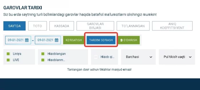 Men olti oy oldin 1xBet bukmeykerlik idorasida ro'yxatdan o'tdim va olti oy davomida sportga pul tikaman. Men shaxsiy hisobim orqali tikish tarixiga kirdim, Ekspress va bitta spotga tikish bo'yicha pul haqida ma'lumot topmadim. Bugun men 300.000 so'mga pul tikdim va yana tikish tarix ro'yxatini ko'ra olmadim. Nima sababdan bunaqa bo'layapti endi hozir? Avval masalan men qancha va qaysi sportga va uyinga pul tikkanlarim xammasi ro'yxatda bor edi. Hozir esa yoq.Kim biladi bu nima bilan bog'liq? Yorqam xizmatiga murojaat qilsam ikki soat javob beradi ![]()