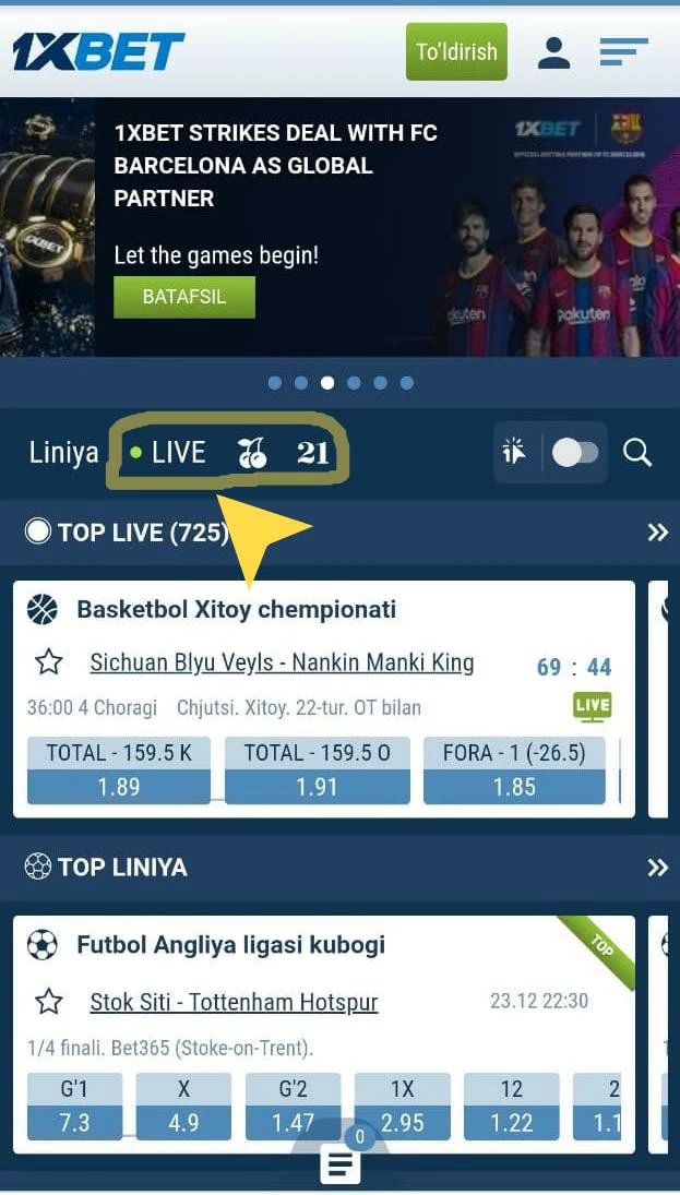 2. Sportga stavka qilish LIVE bo'limiga o'ting.
