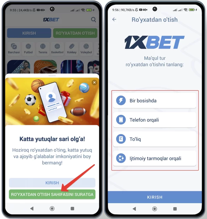 1x betni yuklab olib, o'rnatganingizdan so'ng, tikish dasturini oching va ro'yxatdan o'tishni boshlang. Registratsiya yo'llari tanlang - bir bosishda, telefon orqali, to'liq yoki ijtimoiy tarmoqlar orqali.