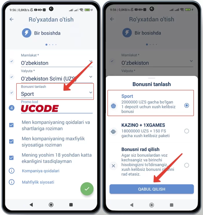 Barcha soʻralgan maʼlumotlarni kiriting va Oʻzbekistonning 2024 yil uchun rasmiy promo-kodi – UZCODE ni koʻrsating. Bonusni tanlang va "Qabul qilish" tugmasini bosing.